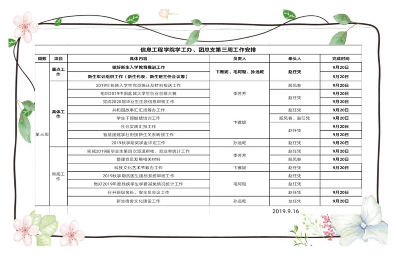 信息工程开元(中国)一站式服务平台学工办,团总支第三周工作安排