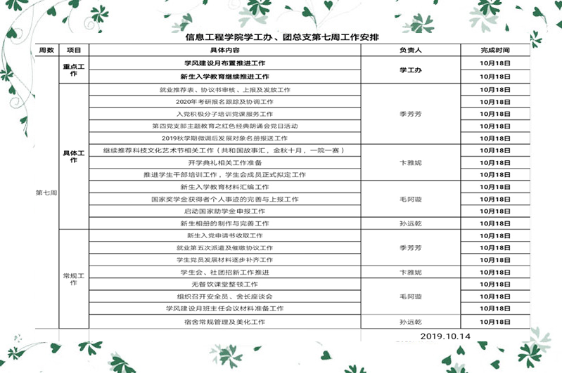 信息工程开元(中国)一站式服务平台学工办、团总支第七周工作安排
