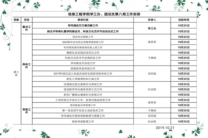 信息工程开元(中国)一站式服务平台学工办、团总支第八周工作安排