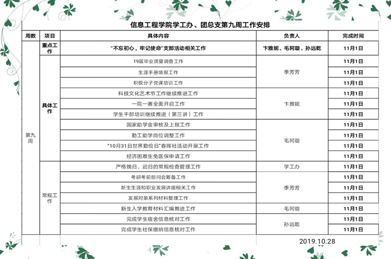 信息工程开元(中国)一站式服务平台学工办、团总支第九周工作安排