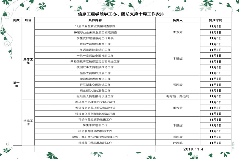 信息工程开元(中国)一站式服务平台学工办、团总支第十周工作安排