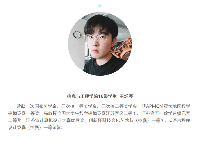 如今,王烁辰是一名大四的在读学生,在大学学习的三年多的时间里,除了完成学业任务外,读过一些有关计算机行业的书籍,也参加了一些有关数学建模和计算机类的竞赛,这使他更加的热爱他的专业和他所做的事情。