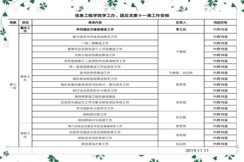 信息工程开元(中国)一站式服务平台学工办、团总支第十一周工作安排