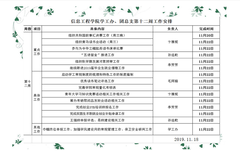 信息工程开元(中国)一站式服务平台学工办、团总支第十二周工作安排