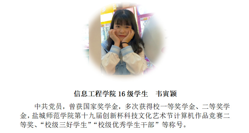2016年9月,踏入了大学校园的她,充满着新奇与迷茫。陌生的人群、新的环境.没有难倒天生开朗的她,很快调整了心态,定了详细目标计划,投入到紧张而忙碌的学习生活中去。三年来:点点滴滴都记录着她的成长。校园里、图书馆里经常看到她手捧书本学习的身影,课堂上的认真听讲,课间与老师的交流,课后的认真预习与复习,就这样一步一个脚印,她的成绩上升到班级第一第二名。难能可贵的是她并没有满足这点,调整学习方法,带动同学们一起共同进步。