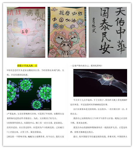 活动要求同学们了解新冠病毒肺炎知识,主动学习“防疫自护”等相关内容,并以绘画、手抄报等方式介绍新冠病毒肺炎的防范知识,记录抗“疫”的日常生活。活动中,同学们认真学习,积极参与,用多种方式表达对战“疫”必胜的信心以及对抗击在疫情一线的英雄们的敬意。
