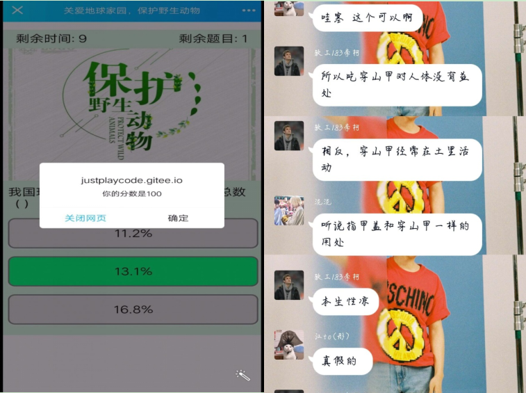 活动以线上问卷、在线交流的形式开展。各团支部选派优秀团员代表参赛,问卷题目涉猎范围广,宣传《中华人民共和国野生动物保护法》,强调野生动物保护,突出法制意识,青年团员们答题认真积极,许多团员获得了满分的好成绩。答题后,青年团员们就如何保护野生动物展开线上讨论,积极表达自己的见解与看法,最后,院团总支负责老师对同学们的精彩表现进行了点评,鼓励大家做保护野生动物的行动者,做生态文明建设的践行者。