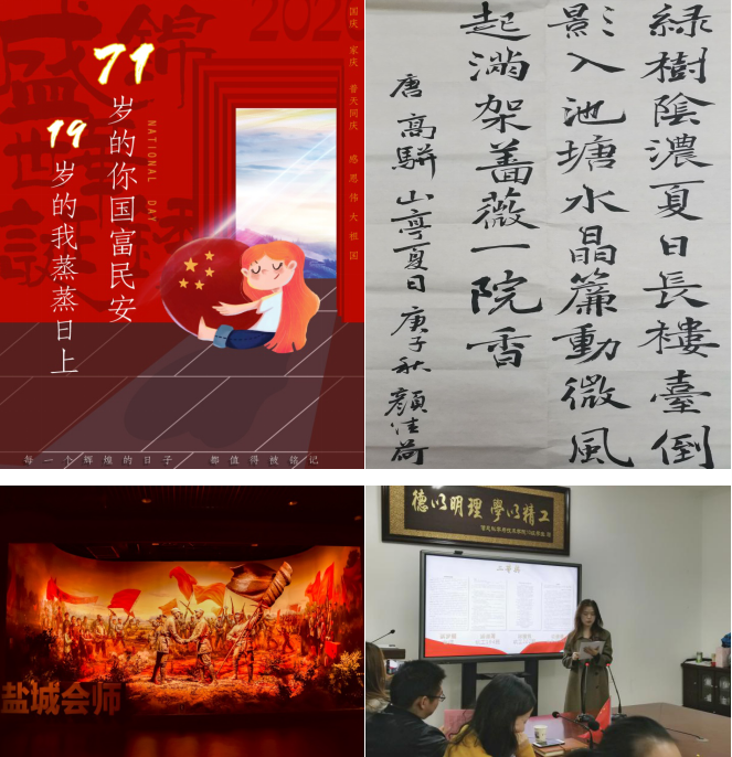 “我和我祖国”主题征文活动启事一经发布,广大师生积极响应,踊跃投稿,收集到征文作品80篇,书法绘画等作品20件。评审组从初评、查重、复评,到终评,在选题、立意、形式、取材等方面层层把关,最终,11篇佳作、6幅字画、3件海报作品脱颖而出。入选作品均体现了时刻不忘治学报国、教育报国的初心,展示师生们飞扬的文采与赤子之心。
