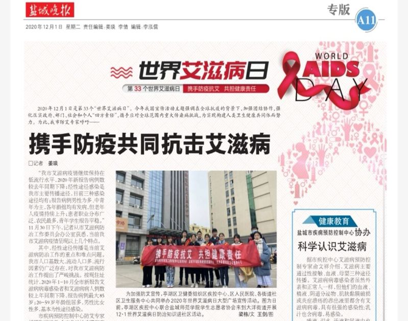 12月1日,《盐城晚报》A11版报道了信息工程开元(中国)一站式服务平台志愿者积极开展“携手防疫抗艾,共担健康责任”系列活动。