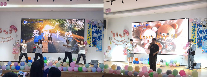 晚会以青春旋律联唱《一笑倾城+去年夏天+晴天》温情启幕,瞬间唤醒校园记忆;活力四射的舞蹈串烧《爱出发+淋雨一直走+闪耀》顷刻间点燃全场热情。随后的《想去海边》以歌声与电吉他交织出夏日的自由奔放;《明天过后》深情传递对未来的期许与坚定;《天黑黑》则以温柔声线抚慰成长路上的迷惘,传递希望力量。尾声节目《爱情公寓》以轻松幽默再现同窗情谊,引发阵阵欢笑与热烈掌声。