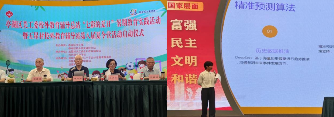 在DeepSeek分享会上,志愿者孙一鸣从平台定位价值、前沿案例实践、技术应用前景三个维度,深入浅出地解读人工智能领域新成果。通过生动形象的讲解与互动问答,在青少年心中播下了探索人工智能的种子。