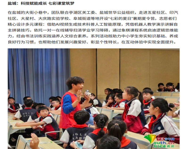 “盐小禾・童心相印”假日课堂走进盐城十多个社区,为百余名中小学生提供作业辅导、象棋、书法及编程启蒙。“老师用积木式教学,我居然做出了动画!”小学生小宇兴奋地说。校社联动品牌获社区感谢信,事迹受中华网、中青校园报道。